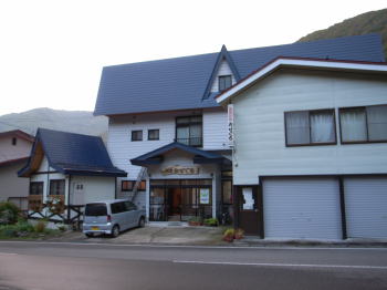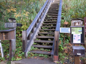 | 桧枝岐の民宿おぜぐちです。この宿は登山口近くに位置していてアクセスが良く、しかも若くて熱心なご夫妻がもてなしてくれる印象的な宿でした。もちろんかけ流しの温泉ですが、目と鼻の先に村の温泉施設もあります。 | 宿から登山口まで車で登ります。登山口の駐車場は3箇所ありますが、駐車可能台数は20台位でしようか。月曜日なのに半分は埋まっていました。登山口は特徴のある木の階段です。 |