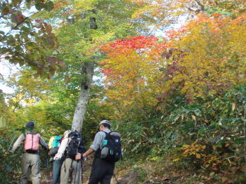 | 取り付きから2時間位は樹林帯の急登が続きます。高度を上げるにつれブナやクヌギ、ミズナラなどが黄葉して行きます。 | 熊除けの鈴というよりモンゴルのヤクのベルを鳴らしながら、黄葉の樹林を辿ると、草原に至る木道が現れ森林限界を抜けたことが判ります。 |