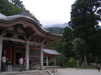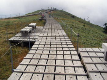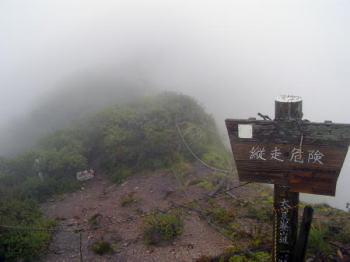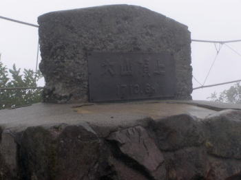 | 雨は6合目避難小屋周辺で弱まり、木の階段から木道に変わった頃から霧になりました。頂上避難小屋に若い人たちが2人いただけで、人に会いませんでした。避難小屋から頂上までは、ほんの数分で騙された感じがしました。弥山頂上着は午前10時45分。頂上には「大山頂上」とある大きな人工の石が置いてありました。 | 頂上から剣ヶ峰への縦走路は通行禁止です。下りは石室を経由して、6合目避難小屋で弁当を食べ、麓の大山寺に着いたのは午後1時15分。川の濁流は変わっていませんでしたが、雨は上がっていました。 |