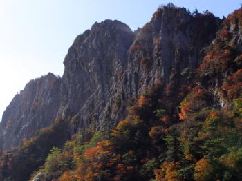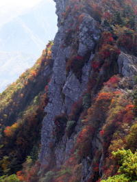| 頂上付近では紅葉が始まっています。青い空と木々の紅葉の間で、灰色の岩壁が映えます。 | 石鎚山天狗岳の岩場です。 |