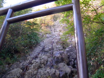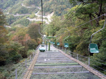 | 下りは御神石を左に見て大剣神社経由して下ります。 | 西島駅でリフトに乗り、左右の紅葉を愛でながら剣山登山を終えました。剣山はアプローチが困難、登山は簡単。紛れもない四国の深山でしょうが、アプロトーチが無ければ「百名山」に入らないだろうと思いました。 身の越で暖かい讃岐うどんを食べ、高松に向かいました。国道とは名ばかりの相変わらずの山間部の幅狭の悪路には悩まされました。 |