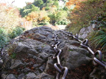 | 鎖場には巻き道がついており、一般の登山者は巻き道を使いますが、オールドアルピニストとしては、鎖場を登るのが宿命のように思えます。「一の鎖場40M」はさほど苦労なく登れました。上の写真の「二の鎖場50M」もまだ余裕を持って登る事ができました。 | 上の写真は下から見た「三の鎖場60M」ですが、この鎖場は足場が無くて腕力も落ちてきて、ひっとしたら落ちるかなと怖い思いもいたしました。 |