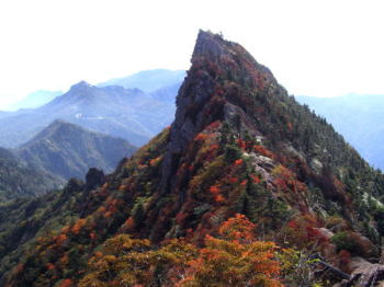 | 10月11日午後天気晴れ、西瀬戸自動車道で四国に入り、今治南で高速を降り、旧西条市を経由して石鎚山を目指します。山間部に入り、かなり深い谷を登って行くと、西之川ロープウェイの乗り口に出ます。バイクは下に残して、ロープウェイで石鎚山成就社まで登り、ここの旅館に一泊しました。宿周辺には高い木があり、雲も出て石鎚山は見えませんでした。 | 10月12日、朝起きると快晴でした。午前6時30分出発。最初何か損する感じで八丁平を下ります。鞍部から急登が始まり、1時間も歩くと不動の水に出ます。ここに「試しの鎖場」がありますが、スキップします。この辺りから石鎚山が目の前に出てきて、弥山から天狗岳への岩壁が迫力を持って迫ってきました。 |