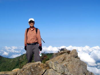 | 剱岳ピークにて、 2006年8月 | 薬師岳 2006年8月 この時バイクで有峰口から折立まで入りましたが砂利の山道にバイクがなじまず、谷底に落ちるのではないかと、剱岳のタテバイ・ヨコバイより怖い思いをしました。 |