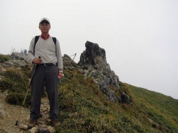| 運の良いことに強い風が霧を吹き飛ばして、時折青空が見えるようになりました。 | 青空の中のトマノ耳のピークです。ツイテいます。風が強くマチガ沢に飛ばされそうです。記念写真を済ませ早々とピークを後にします。 |