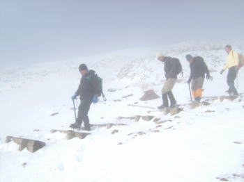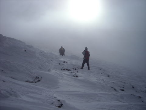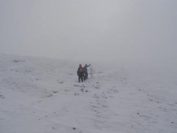 | 風が唸る音で、会話が聞き取れません。大声で怒鳴り合って話しますす。 | 帰路のホワイトアウトの恐怖でピークを直ぐに退散します。視界はますます悪くなってきました。 |