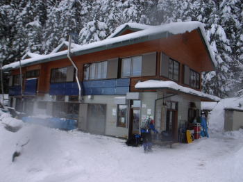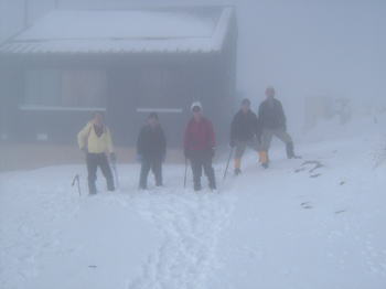| 天神ザンゲ岩を過ぎると広い雪の斜面にかかります。風が強くじっと足元だけを見ながら登ります。 | 肩の小屋に着きました。小屋は閉鎖しています。小屋の裏手にザックを置いてピストンにかかります。 |
