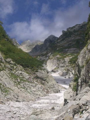 長次郎谷 長次郎の雪渓との、伸び伸びした合流点から八ッ峰方向を眺めて下ると、真砂沢に至り剱沢の左岸に移る。シュルンドも殆どなく問題はない。 |