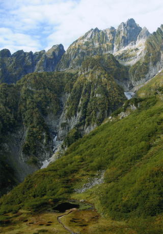 河原歩きで二股に着く。吊橋を渡ると仙人新道の急な登りが待っている。 樹林帯をひたすら登るが時々視界が開けて三の窓雪渓や小窓が見え胸が躍る。ここまでは快晴であったが、ガスが出てきて時々雨がぱらつく。ガスの去来する剱の岩と急峻な雪渓の眺めも好もしい。 絶景と回想に痺れるような今日の漫歩も10時間を越え、さすがに疲労を感じる頃にようやく仙人小屋に着く。先ずはビールそして名物の池を前景にした八ッ峰方面の、まるで絵葉書そのものの景色に見入る。 小屋には風呂あり、名物の女主人が皆に優しく食事のお代りを勧めてくれる。数十万円のカメラを抱えた中高年カメラマンのメッカでもあるようだ。朝日に映える池越の岩稜を撮るための場所確保のため、夜中に起きてカメラの三脚を立てに行く人もいるそうな。 我らが映像芸術家の保屋野君は成り行きに任せて眠る。 |