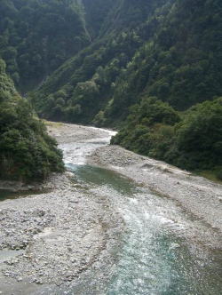 5時に起きると沛然たる雨。作っておいてもらった弁当を急ぎ食べて、雨具を着けて6時出発。水平歩道に出るまでの登り返しがきつい。登りきると楽なプロムナードになるが垂直の岩壁をくり抜いた道で右側は黒部川に垂直に切れ落ちていてスリル満点である。 折尾谷手前の滝は雨のための増水もあって素晴らしい景観。頭上の岩からは雨が滝のように降り注ぎ、傘をさすと身体が振られて危険だ。雨と汗に濡れ、意外に低い岩の天井にしたたか頭をぶつける。 今日一番で独り歩いていると本で読んだ熊の話を思い出す。冬眠前に干物でも食うことを思いついた美食家の熊に断崖で鉢合わせすることを恐れ、あまり効果はないと思うが時折大声で何かを怒鳴ってみたりする。 堰堤のトンネルを潜り、圧倒的な高度を感じる大太鼓を過ぎ、やがて志合谷のトンネルに至る。距離は150m程なのだろうが、ヘッドランプを点けても、水の流れる足元がかすかに見える程度で殆ど先は見えない。小屋で教わったとおりひたすら右側の岩に沿って姿勢を低くして歩く。 最後の送電線の鉄塔に出る辺り雨も上がり日が照る。後から下ってきたうら若い女性二人に追いつかれる。聞けば小生より30分も後に小屋を出た由。華やかに軽やかに笑いながらあっさり追い越してゆく二人をヨロヨロと追うが完全に振り切られる。淋しい。高年登山者は哀しい。 欅平駅着10時15分、悪くないペースであったが疲れた。 (栗又組−10月6日・阿曽原小屋6:40発〜9:40 トンネル〜12:10 欅平駅) |