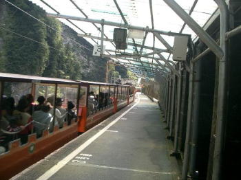 欅平からはトロッコ電車に乗り20Kmを1時間15分程度宇奈月へ。 秋とは思えぬ日差しと快い風に服が乾いてゆくのも嬉しい。 宇奈月では旅館の温泉より公衆浴場の温泉が実利的だと駅員さんの勧めで、駅近くの銭湯に行く。さっぱりして大ジョッキで独り乾杯。 |