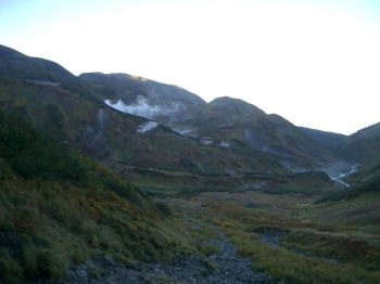 | 地獄谷を後に | 朝日のあたる大日岳 |