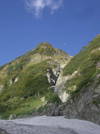| 真昼の月 | 剱沢右岸を辿る 若かりし頃に剱沢小屋辺りに張った天幕から、苦もなく通ったルートも今は結構なアルバイトである。しかし、我々のほかに人影もなく青い空、雪渓の向こうに迫る灰褐色の岩壁と這松の緑に酔う思いで剱沢右岸を辿る |