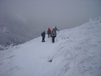 | 一ノ倉から茂倉岳の稜線です。眼下に万太郎谷が広がっています。万太郎、仙ノ倉の稜線は雲の中で見えません。 | 下りは迷わずアイゼンを装着します。肩の小屋を後にしたら回りは再びガスに包まれてしまいました。 |