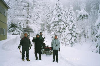 | 12月23日 夏沢鉱泉送迎サービスによって、茅野駅まで四駆で迎えにきてもらいます。途中桜平の駐車場から、おむすびのようなキャタピラの着いた雪上車に乗換え、途中2箇所、沢に入って渡りながら夏沢鉱泉に向かいます。 |
