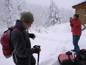 | 1時間程でオーレン小屋に着きました。昔から名前だけは聞いていた小屋ですが、初めて見る小屋は2棟建て新築の堂々たるものです。もちろんこの時期は無人です。オーレン小屋という不思議な名は黄蓮小屋の意味だそうです。 | オーレン小屋から登るにしたがって雪が多くなります。急な登りもなく夏沢峠に着きました。風が強く荒涼たる峠です。ここから吹きさらしの稜線が始まるため、風を除けて小屋陰で完全な冬山装束に調えますが、作業をしていると手の感覚が無くなって来ます。 |