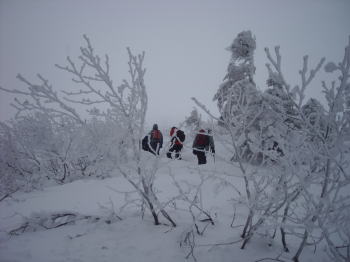 | この斜面の下で先行のパーティが強風のため引き返してきました。樹林帯を抜け疎林帯に入ると、猛烈な風が襲ってきました。 | 疎林帯の斜面は雪が吹き溜まりラッセルを強いられます。急なため足場が固まりにくく消耗します。 |