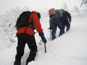 硫黄岳は久々に冬山の厳しさを体験した山行でした。 今回は夏沢鉱泉まで送迎付で、2060mの宿から、2430mの夏沢峠を経由して、2760mの硫黄岳に登る、標高差700mの行程は、箱根駅伝の箱根の山登りの標高差860mより少なく、技術的にも体力的にも、楽勝ムードで出かけました。 それでも冬山ですから、万一に備えてザイル、各自確保用のベルトとスリング、ガスコンロ2台と食料、風の名所の硫黄岳ですから風対策の防寒準備は充分に気を使って整えて行きました。 結果、自然の猛威は、昔の多少の経験によるごまかしでは対応出来ず、もろに私たち老体に襲って来たのです。あの凍えるような寒さ、冷たさ、唸るような風、はっきりしない不安定な斜面、ホワイトアウトの恐怖など、冬山に普通に存在する様々なものが同時に押し寄せてきて、入山前の楽勝、楽観ムードは瞬時に吹き飛び、もう寒い冬山はこりごりになりました。 |