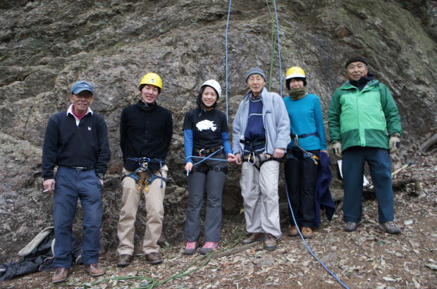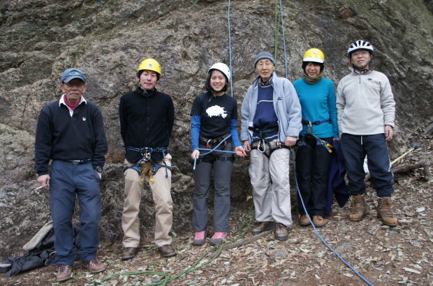 首都圏に雪の予報伝えられた2月19日、飯能の天覧山で現役学生対象のザイルトレーニングを行いました。 今回のザイルトレーニングは、昨年秋八ヶ岳の縦走において、学生たちから縦走路の岩場の身のこなし方や、いざという場合のザイルワークを学んでみたいというニーズの基に実施されたものです。幸い雪は関東沿岸地のみで内陸は雪が降らず、体の芯から冷え込む寒さでしたが、それにもかかわらず現役学生諸君たちは元気一杯に岩場を楽しみました。また豊田OBの奥さまも特別参加されました。参加者たちはは、練習後半になると岩場で流れるような身のこなしが可能となり、上達の速さが印象的でした。ザイルトレーニングが終わった後、学生諸君からまたをやってみたいという声が挙がっていました。 尚現在天覧山はお寺の私有地で岩場を使用するには届けが必要です。 参加者:現役学生、増田幹事長、時さん、上田代表、井村副代表、豊田OB夫妻、金子OB |