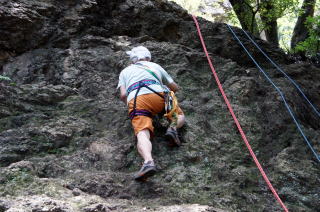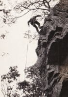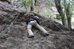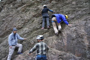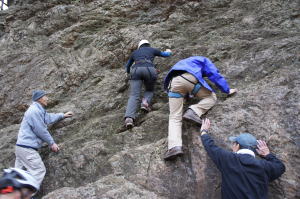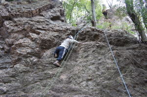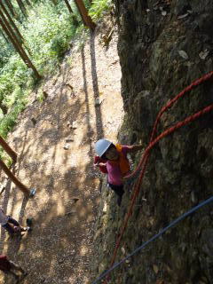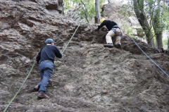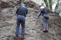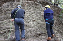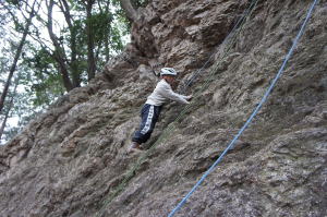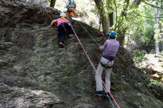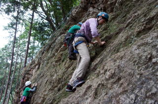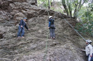 | 久須美君と豊田夫人が登ります。 | クライムダウンして、途中で岩から手を離し、ザイル確保の有効性を肌で感じます。 | 次に山川君と中戸川さんが登ります。山川君が手を離しています。 |