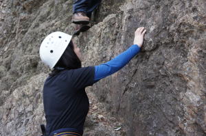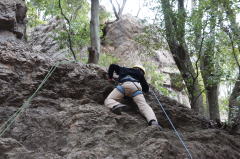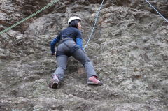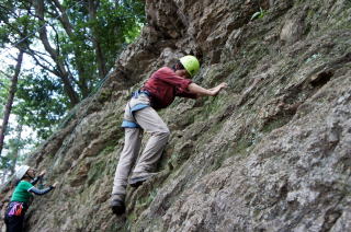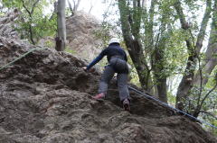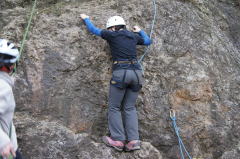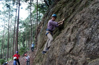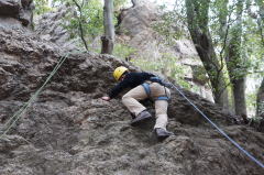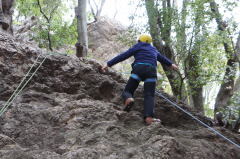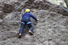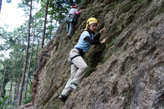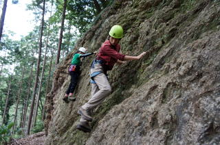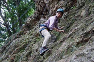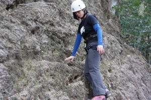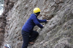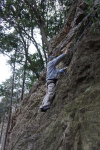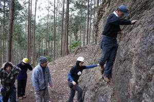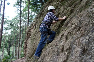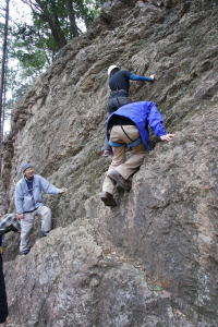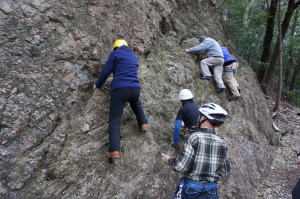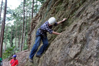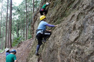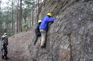 | 下で豊田OBの確保基、増田君が登ります。 | 岩から体を離す感覚を体験します。 | 途中まで登りクライムダウンを行います。 |