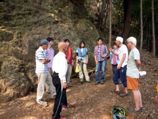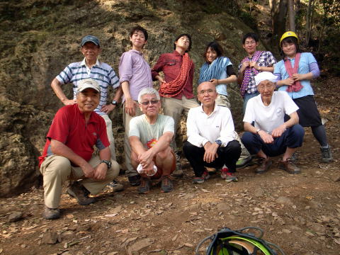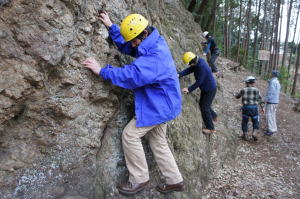 | 飯能駅に9:30集合し、バスで天覧山の麓に行き、そこからピーク下の岩場に集結しました。 | 初めてのザイルトレーニングで 増田幹事長も張り切っています。 | 井村OBが三点確保の基本を説明します。 |
