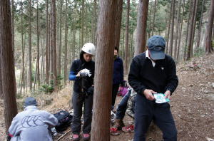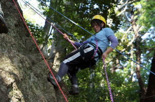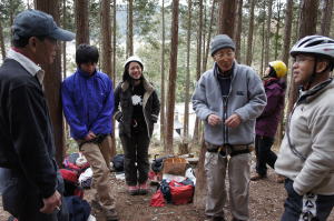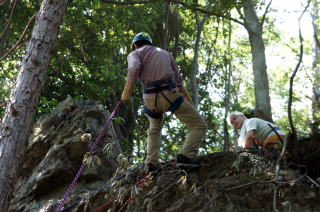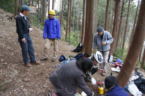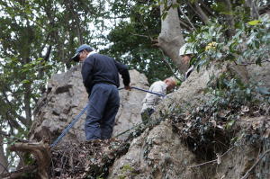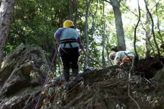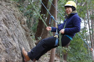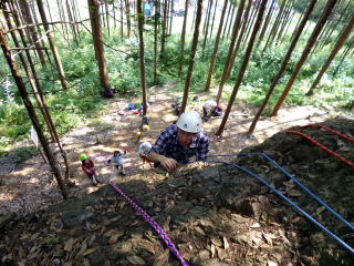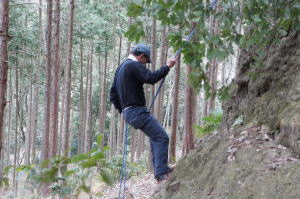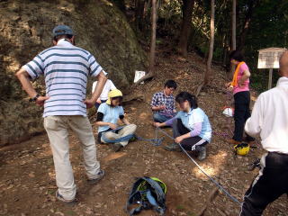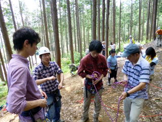 | 午後の部はザイルを使用したトレーニングです。 | 上の立木を支点として井村OBが肩がらみの懸垂で下降します。歳を感じさせません。 | 上田代表がザイルの結び方をコーチします。 |