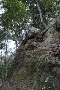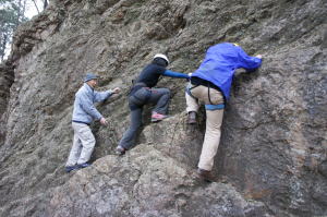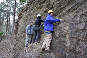 | 底冷えの日ですが、素手で岩に触らなければなりません。 | 増田君と時さんが登り始めます。 | この大ハング下の高さ約10m岩場はバンドが斜めに登っていますが、直登ルートはスタンスが細かいです。 |