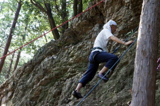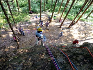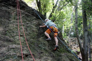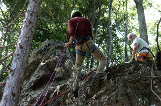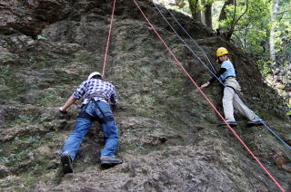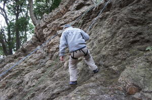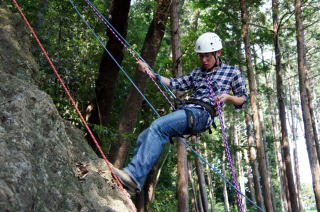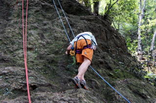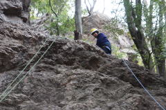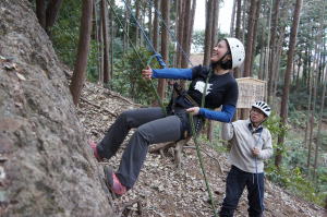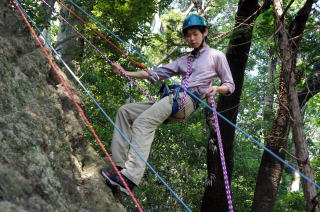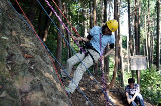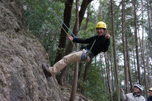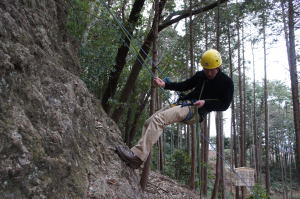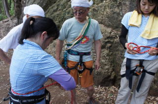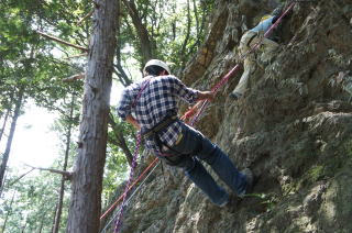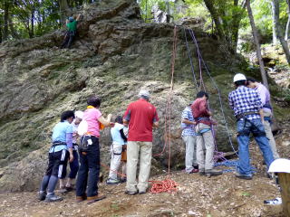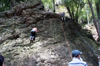 | 岩登りの名手、上田代表が見本を示します。 | スルスルとあっという間に上部に達しました。 | ハーネスに装着したザイルを張りながら、完全なクライムダウンを行い、ザイルの信頼性を説明します。 |