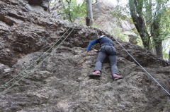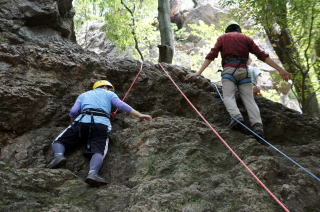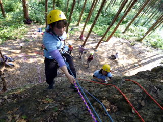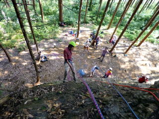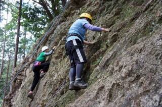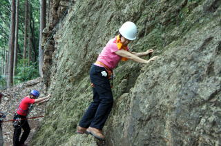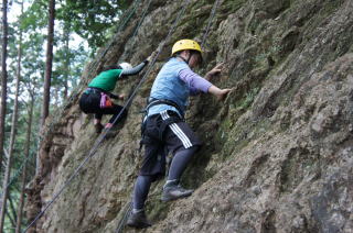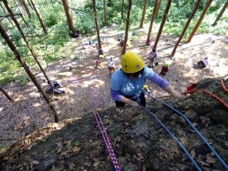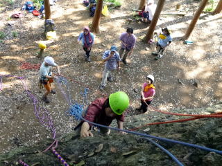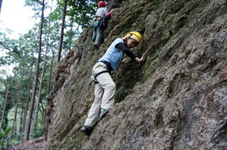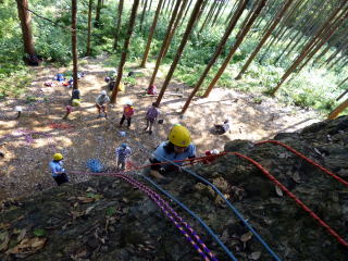 | 次にザイルで確保しながらのトレーニングです。ザイルの結束方法を学びます。 | 何回も繰り返します。 | トップロープでのトレーニングです。 |
