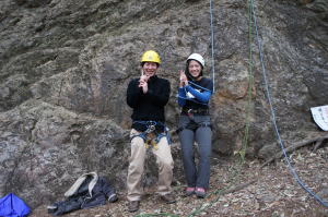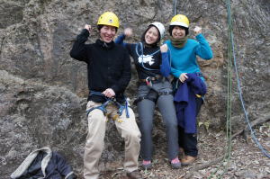 | 時さんの 2回目の懸垂によるクライムダウン。見違えるようにスムーズです。 | 増田君の 2回目の懸垂によるクライムダウン。余裕のVサインです。 | 豊田OBの奥さんの2回目の懸垂によるクライムダウン。落ち着いています。 |