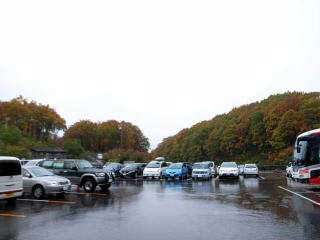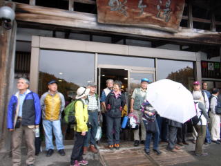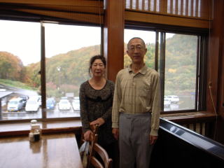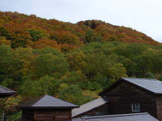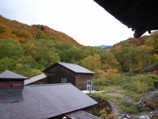 | 酸ヶ湯での朝、太郎良OB(43年卒)ご夫妻と食堂でばったり出会いました。聞くところ太郎良OBご夫妻は、毎年紅葉の頃酸ヶ湯に逗留しているとのこと。昨日の晴天で高田大岳から縦走したとのことで、後日メールでは、この夜は連泊した上田代表ご夫妻と歓談したとのことでした。 | 酸ヶ湯の部屋の窓から紅葉を眺めます。雨は映りませんが、結構降っています。 | 酸ヶ湯には20数年に泊まったことがありますが、そのころに比べると、増築されて大きな観光施設になり、玄関ホール横のカウンターには、制服姿の女性たちが迎えてくれて驚きました。山の宿というよりすつかり旅館に変っていました。 |