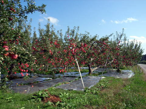 夏にはまたリンゴを赤くするため、リンゴの周りの葉を取り除く作業も行います。そして日光に向いていないリンゴの裏面に陽を当てるための玉回しを1個1個行いますが、これら作業は脚立に乗って行うだけに大変です。最後に画像のように、リンゴのお尻を赤くするために、銀のシートを樹の根本いっぱいに敷きます。 そうした一年の汗の結晶がこのリンゴ畑です。今年も津軽海峡に台風が通過しないことを祈るばかりです。 |