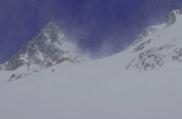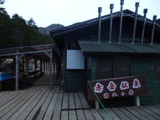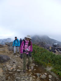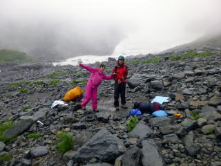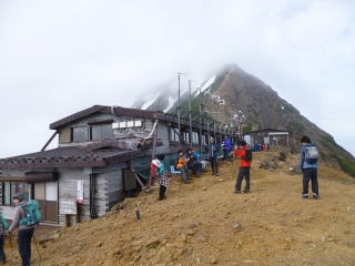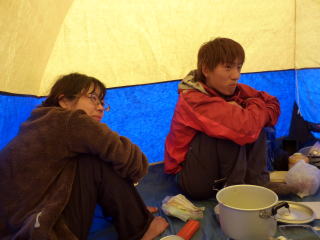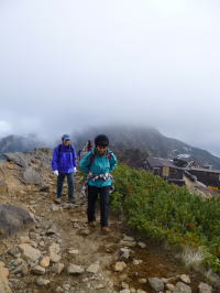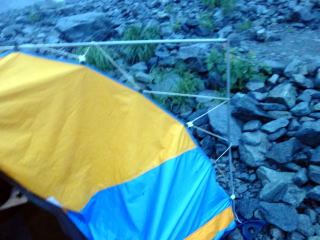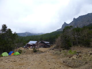 | 夕食後まもなく雨が降り出し、夜は暴風雨となりました。山側に頭を向けて寝た島田OBと金子は風雨でテントが顔の上に圧し掛かり、雨も浸水してくるのでろくに眠れませんでした。朝起きてみたらポールが折れており、テントが変形していました。時折強い雨が降る天気です。 | 学生たちも、あまり眠れなかったようです。夜中に声がしていた隣のテントは無くなっていたので、ヒュッテに逃げ込んだのでしょう。ヒュッテのTVで台風情報を見て、小屋の人も、ここ2~3日は悪化するばかりで、好天の見込みが無いと天候にはあきらめ顔でした。 これら情報を基に井村OBが決断し下山と決定しました。 |
