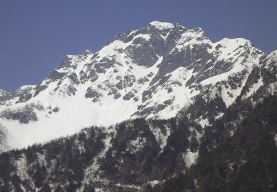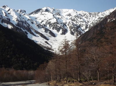 田野辺OB・井村OB 2013年5月8日~11日 昨年は同じ5月に穂高に入り、今年3月は八ヶ岳縦走と同期の田野辺OBとペアで登ってきた。さて今年の5月は「どこに登る??」と催促がきた。白馬の大雪渓は雪崩が怖いし、あとは鹿島槍か剱か、八方~五竜、燕岳も登っているし、結局伝統的なル-トながらも槍沢から槍ヶ岳でもと5月の連休が終わる頃、また上高地にやって来た。何時もながら5月の上高地からの穂高の岳沢はまだびっしりと積雪で輝いていたが、今年の小梨はまだ芽吹くには早いようだ。 |