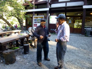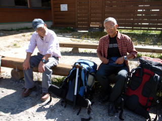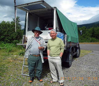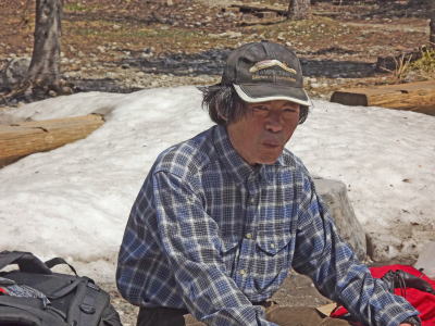 13;33 望岳台 河西・狩野 望岳台へ戻ると帯広の河西さんが迎えに来てくれていた。22年前に旭岳石室でお会して以来のアイボールだった。愛車の三菱キャンターは荷台に軽自動車の荷物室を載せ、山野踏破・狩猟・車中泊など多用途にカスタマイズされていた。持参された弁当や飲み物の御馳走に与り、しばし話し合った。 |
