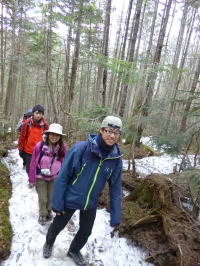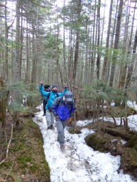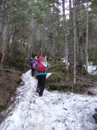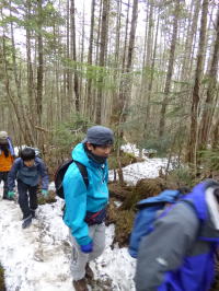 | 地蔵尾根の樹林帯を登る。 | 今年は雪が多い。 | 元気に高度を稼ぐ。 |