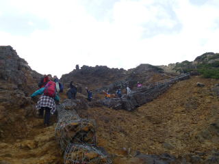 | 09;20 十勝岳山頂 狩野 岩塊の急斜面を登り、▲十勝岳2077mに登頂した(9:20)。他に登山者はいなかった。横殴りの雨を下山にかかった。周囲の景色は飛霧の中だった。砂礫帯に下るとタイツ姿の男女が駆けたり下半身素肌の長脚西洋人が速いペースで通り過ぎて行った。 |