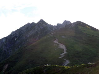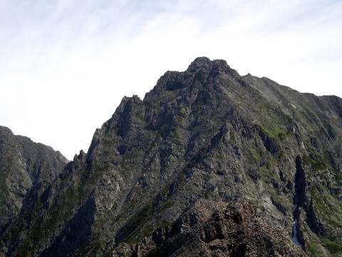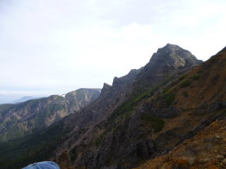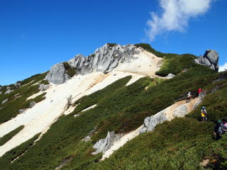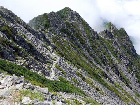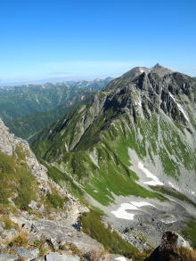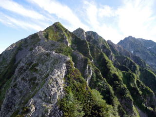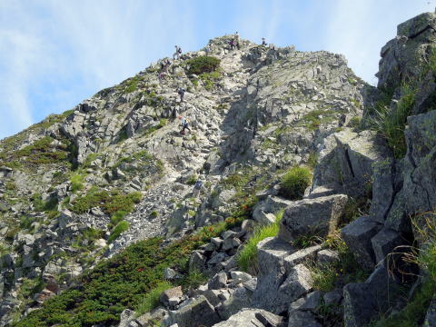 | 独標の下りはギャップ気味で下が見えません。山荘のネット案内では、この降りで手こずるようであれば、この先は止めた方が良いとありました。とても上手い表現と想いますが、そのため独標からは、極端に人が少なくなります。 | ピラミッドピークの登りは高度を稼ぎます。空気が澄み天気も良いので、明るい夏山の気分を十分味わえます。但し気温は高くなく、半袖になる必要はありません。ここまで約2時間です。 | 目の前のピークの向こうが西穂高です。ぐっと近づいて来ました。目の前のピークは昔は無名でしたが、最近ではチャンピオンピークと呼ばれているみたいです。 |