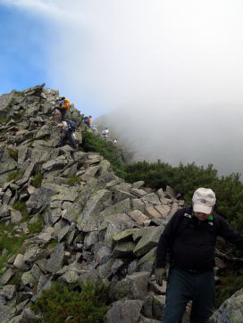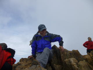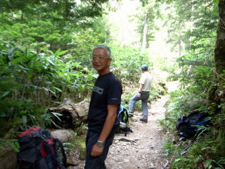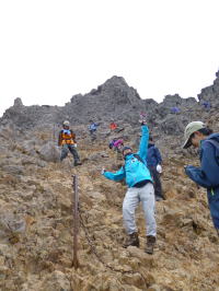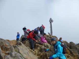 途中でトップを変わります。この辺は、時々明神の最南峰を見上げながら歩く余裕がありました。 | 明神に着きました。今日はいやに空いています。台風が近づいているからでしょうか。 |