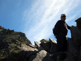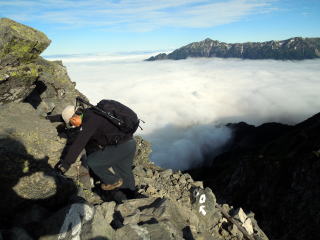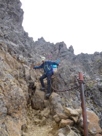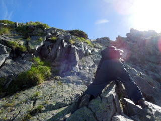 | いよいよ西穂高ピークに近づいてきました。 | ピーク直下は手を使って登るピッチがあります。 | 歳をとってバランスが悪くなっているため、かえって3点確保しながら上り下りするピッチの方が楽です。 |