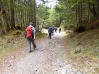 3時に目覚めると隣の女性が来て、男性が不調だからと同行を誘われた。入山ポストに記入し女性2人と3:45出発した。河西さんは車に待機。先頭の私は緩い道だが温泉コース分岐まで30分(ガイドマップの1.5倍)かけてゆっくり歩いた。徐々に勾配を増した。私は、「間質性肺炎で登りは心拍数が上がり息苦しくなるのでゆっくり登るが、遅いと思ったら追い抜いて下さい。」と伝えた。間もなく、「先に行かせてください。」と言われ2人に追い抜かれた。 |