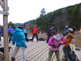 | 傾斜もなく形だけですから、足が上がらず、あまり臨場感もありませんが、停止のコツだけはコーチします。 | 昔は、11月の雪上訓練合宿だけでなく、機会あるごとに訓練を行った記憶があります。新人の時の夏合宿で雲ノ平に集中した際、縦走中台風にたたられようやく訪れた晴天の日、衣類を乾かしているときに、新人のみ雪上訓練を行わされ、皆でふてったことを思い出します。昔はろくな雨具がないので、無雪期の訓練は通常着のままで行いました。 | 記念写真を撮りここで解散します。OBは学生に着いていけないので、別々に下山します。 |