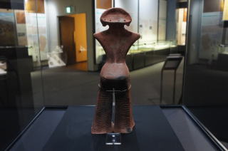 山形県立博物館の国宝土偶「縄文の女神」です。 平成4年(1992)に最上郡舟形町で発見された約4500年前の縄文中期の高さ45㎝の大型土偶です。過去パリ、上海、ドイツで展示され、特に大英博物館で大評判を呼び、2009年に国宝に認定されました。 この美しい土偶を見ると、縄文人の造形の美意識の高さと、これを作りえた豊かな環境が偲ばれます。 |