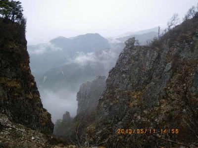 5.11(土)天気予報は昼まで雨。7:45まで様子を見て雨中出発。中型犬が一匹ついて来た。八経ヶ岳(1915m)、明星ヶ岳を過ぎ、崩壊箇所を高巻くも犬がついてきた。仏生ヶ岳、孔雀岳と倒木くぐりを繰返して進み、椽ノ鼻付近で霧が晴れ岸壁越しの景色(写真2,3)が素晴らしい。釈迦ヶ岳の岩場・鎖場は大きなギャップで遅速。四足の犬は乗り越えて私にまとわりついてきた。雨中荷の重さを感じて下半身疲労蓄積。下り道は雨に濡れて滑り易かった。夕刻降りやむ期待は実らず、寒風と雨に冷やされた。深仙ノ宿避難小屋に入った。 |