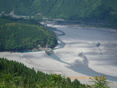 5.15(水)五大尊岳、大黒天神岳も大きかった。熊野本宮大社が見下ろせる(写真5)ようになってからの道のりが長かった。日射と暑さの中、七越峰から大きく迂回した奥駈けのルートが長く、やっとのことで熊野川へ至った。川幅は数百メートルある。一昨年の台風で本宮の家々の一階部分が水没したそうだ。渡渉の深さは膝下だった。 120年前の水害で遷宮するまえの旧熊野本宮大社のあった大ゆの原へ至り、奥駈縦走修了として下山報告をメール発信した。 |
