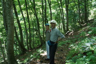 | この陸奥と出羽の分水嶺の堺田はカルデラ地形の高原です。かっては軍馬を量産した小国駒の産地で、この高原の美しさは、今回の旅の最大の発見でした。北上山地を初め、我が国にはまだまだ観光地化されていない美しい場所があるのだなと想いました。 | 山刀伐峠越えの道は、完全な登山道で、細くて急なため、馬や牛が行きかう道ではありません。狭い自動車道の旧道もありますが、現在では山刀伐峠の直下はトンネルで立派な県道が走っています。芭蕉は山刀伐峠の句は残していませんが、不安で俳句どころでは無かったのでしょう。 |