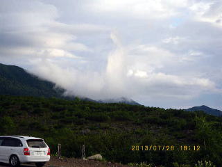 | 18;13 望岳台から十勝岳 途中、名水(延寿の水)を充填し、白金を通って望岳台駐車場へ着いた時(18:00)には十勝岳の霧雲も薄くなっていた。車横にテントを張るがペグを打てないので荷物で風に抗した。 |