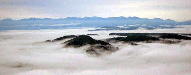 7.28 18;12上ホロカメットク方面乱気流、望岳台から 冨良野平野に出ると左手の芦別岳は雲が掛かかっていたが冨良野西岳から北は雲に隙間があった。空は不安定で、十勝岳連峰を南東から越えた暖湿気流が笠雲となって被さり、風下側十勝高原上空で山岳波が上下に波打ち、上下多層に吊し雲やレンズ雲を飛ばしていた。狩野OBはグライダー乗りなので空の気象に注目しながら運転した。 |