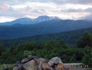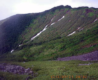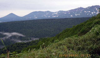 04;26 望岳台から旭岳方面残雪 望岳台(930m)を4:20出発した。大雪山旭岳方面を望めたが行く手の十勝岳は雲の中。十勝岳避難小屋(1320m)を過ぎ、下方に虹が見えた。登るにつれ風強まり雨が打ちつけた。高度を上げるにつれ暗く視程も悪くなった。 |